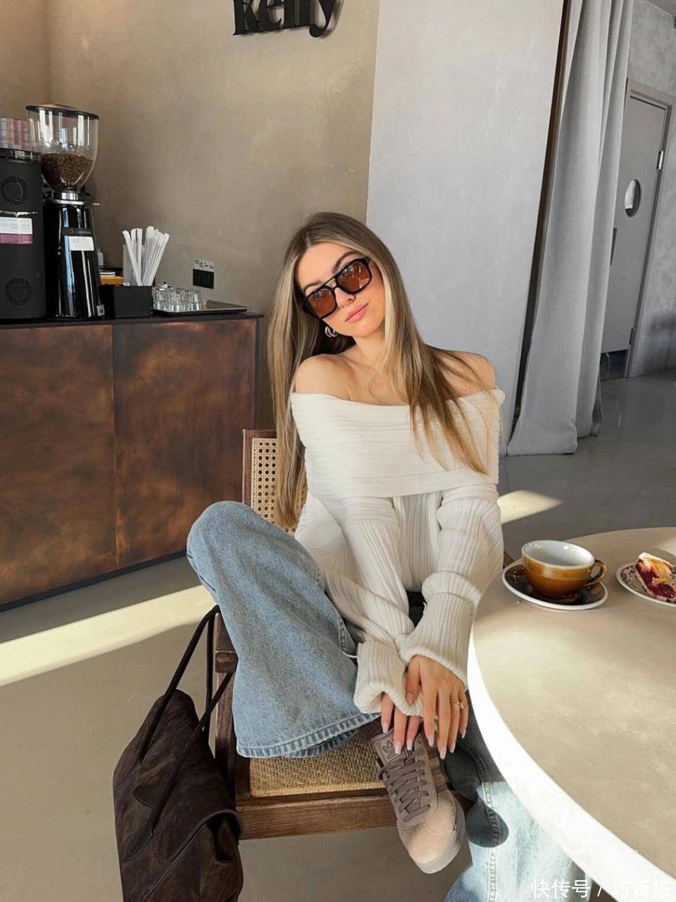 选择驼色板鞋,还可以与绝大多数浅暖色系单品搭配,比如白色一字肩针织毛衣和水洗蓝牛仔裤,两者搭配清新明媚,有种万物复苏、欣欣向荣的高级感。